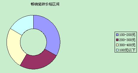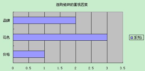 從該圖可以看出,目前市場上大眾普遍能接受的瓷磚價格為100-200元/平米,其次是200-400元/平米的瓷磚,而選擇價格最低的100元以下的消費者最少。由此可以分析出,價格不一定是消費者最看重的因素,高價位的瓷磚同樣暢銷,只要質(zhì)量過硬,讓消費者在購買的過程中感到物有所值,這樣的產(chǎn)品才能在市場上立于不敗之地。