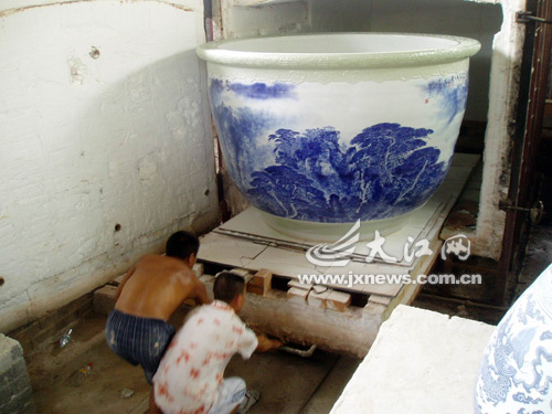 為制作這件作品,徐四金投入10余萬元,歷經(jīng)多次失敗,歷時1年多才燒制成功。據(jù)他從上海大世界基尼斯紀(jì)錄總部得來的消息,目前尚沒有最大瓷缸的紀(jì)錄,一經(jīng)該部確認(rèn),這只瓷缸將成為世界第一大缸。