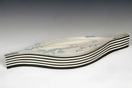 該作品創(chuàng)作靈感來自于作者對“春江花月夜”的感悟。作品將多層薄泥片(厚度為1毫米左右)豎置重疊。多層泥片的重疊以及泥片在燒成過程中的自然擺動,形成線的韻律感。陶瓷泥料在高溫狀態(tài)下的變形是陶藝創(chuàng)作難以逾越的材料特性。這里充分利用了瓷泥的變形,將創(chuàng)作中的難度與偶然演繹為作品的線的韻律感,泥片其上的圓點(diǎn)的運(yùn)用增強(qiáng)了作品形式美感,也深化了“春江花月夜”詩意的美。