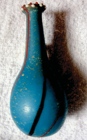 公元六一七年李淵父子在晉陽起兵反隋,李淵于公元六一八年稱帝,世稱唐高宗,建帝都于長安,唐代共歷時(shí)近三百年,在唐太宗李世民執(zhí)政的貞觀年間,國力強(qiáng)盛國土寬闊,可謂雄風(fēng)豪邁,四方各國紛至沓來朝貢,往來于“絲綢之路”與大唐帝國建立貿(mào)易關(guān)系,國民經(jīng)濟(jì)大步發(fā)展,即后世稱為“貞觀盛世”也,當(dāng)時(shí)由宮廷制作的絢麗多姿出神入化的唐代金銀器和琉璃器亦稱譽(yù)世界。雖然琉璃器于漢魏時(shí)期由埃及西歐等國作為貢品進(jìn)入中國,但至唐代時(shí)中國已能吹制出質(zhì)量很高、器壁極薄、光亮度極美的琉璃重器,備受世人珍愛。 本文所示圖為唐代四色琉璃鑲嵌寶瓶。此瓶系用唐代的手工鑲嵌吹制工藝,造型優(yōu)美流暢。雖遍體疤痕滿布粉色“銀釉”,卻掩蓋不住它“寶光四射”的英姿。在深綠色的瓶體上嵌入靛藍(lán)、玫紅色琉璃線各二條盤旋而上至瓶口,讓觀者有種隨風(fēng)起舞之感,而曲線優(yōu)美的瓶頸自然地延伸至瓶口,造型猶如一顆碩大碧水自天而降。瓶口向外翻卷并在上面鑲嵌二排紅色及白色的琉璃珠,盡顯唐王朝工匠高超的技藝和聰明才智。