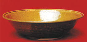 閩北私人收藏的一只五代醬黃釉唇口大碗 見(jiàn)圖 ,高5.8厘米,口徑20厘米,足徑10厘米,造型顯得寬矮、規(guī)整、輕巧,厚唇,口沿外翻,碗壁略顯斜直,胎壁較薄,寬矮圈足,見(jiàn)堅(jiān)致的灰白色胎,碗內(nèi)壁底見(jiàn)圓形澀圈無(wú)釉,而澀圈內(nèi)中心有釉;圈足及足端無(wú)釉,而圈足內(nèi)又滿釉,并見(jiàn)弦刷釉痕。內(nèi)外壁均施滿醬黃色釉,開細(xì)小冰裂紋。碗外壁見(jiàn)施釉不勻之縮釉點(diǎn),釉薄處可見(jiàn)壁上的輪制弦削痕以及近底足處的竹片刮削痕。