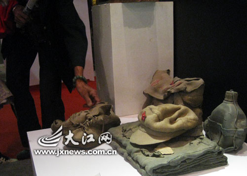 在一樓展廳中,2009景德鎮(zhèn)當代國際陶藝展展出的作品,顯示了中國、美國、愛爾蘭、韓國等各地藝術家的創(chuàng)意。這其中,最逼真的陶藝作品是來自中國陶藝家名為《昨天》的展示。布滿灰塵的紅軍帽、軍用水壺、背包,略顯破舊的膠鞋。幾乎每一個經過這幅作品的參觀者都會邊用手摸摸,邊說:“呀,是真的用瓷器做的。”