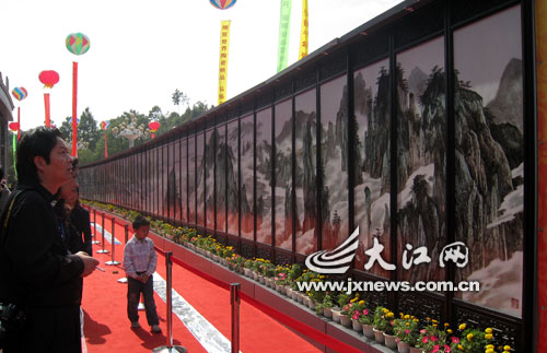在展廳的入口處,作為新中國六十周年獻禮作品,幾幅瓷板畫是瓷博會上當之無愧的龐然大物。畫有靈猴、飛瀑、仙桃的《群猴集瑞圖》是目前世界上最大的粉彩瓷板畫,也是世界最大的以動物為題材的粉彩畫。它與陳列在旁邊的《馬到成功圖》共同分享2009瓷博會展出的最大單瓷板畫桂冠,同時這兩幅作品也列入吉尼斯紀錄。另一邊,全長42米的《西江攬勝圖》全景展現(xiàn)了江西的壯麗風貌,該作品已經申報吉尼斯世界紀錄。