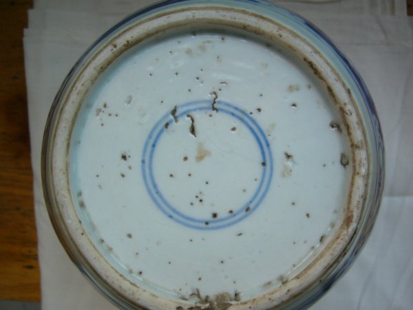 這是一只清代康熙時(shí)期的青花冰梅開光博古紋罐,這個(gè)罐子鼓腹、圈足,尺寸碩大(與同類罐相比),胎質(zhì)堅(jiān)實(shí)、厚重,胎釉結(jié)合緊密,釉水滋潤明亮,器型和胎釉具備典型的康熙特征。罐身紋飾是冰梅地三開光,開光內(nèi)畫的是博古紋和八吉祥紋,紋飾工麗細(xì)致,開光外的冰梅地也是典型的康熙冰梅畫法。瓷器釉色:蛋清釉。配紅木蓋。