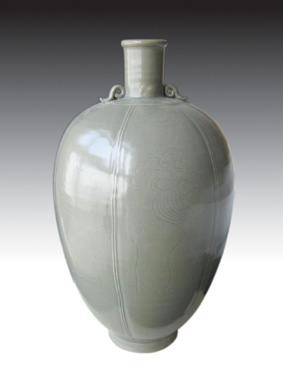 晚唐詩(shī)人陸龜蒙在《秘色越器詩(shī)》中贊美越窯瓷器的釉色為:“九秋風(fēng)露越窯開,奪得千峰翠色來(lái)”。越瓷的釉色以青為主,青中帶灰,形成特有的“艾葉色”,晶瑩潤(rùn)澤。越窯創(chuàng)燒于唐朝至五代時(shí)期,燒制技術(shù)至宋朝已達(dá)到爐火純青的地步了。 在當(dāng)時(shí)的吳越一帶,即現(xiàn)在浙江的余姚、上虞、諸暨等地出現(xiàn)了大量的越窯古窯址,這表明了盛唐政治安定,經(jīng)濟(jì)繁榮,制瓷業(yè)興盛。從五代 公元907 960年 起,制瓷業(yè)開始設(shè)立“御窯”即“官窯”,產(chǎn)品專供宮廷使用,越窯瓷器作為御用的也稱為秘色瓷,宋人曾慥《高齋漫錄》說(shuō):“吳越秘色窯,越州燒進(jìn),為供奉之物,臣庶不得用,故云秘色”。秘色實(shí)即還原焰經(jīng)1300℃高溫?zé)傻,釉色即所謂艾青、湖綠、翠青的“千峰翠”色。 本件藏品是一件五代越窯瓜棱云紋雙系梅瓶,瓶高31厘米。梅瓶是古代的儲(chǔ)酒器,釉色為典型的艾青色,通體施釉,圈足支燒,底部陰刻“內(nèi)”字(見圖),可見這件作品是當(dāng)時(shí)供“內(nèi)府”使用的官窯器。整件梅瓶刻有六條瓜棱線,并在瓶體上以本色釉劃刻六朵飄帶立云紋,瓶肩部塑二圓孔,便于穿繩系帶,瓶口外卷,亭亭玉立,美不勝收。五代梅瓶與后世梅瓶稍有不同的是口頸稍長(zhǎng)、肩腹較寬,并帶有雙系,這是梅瓶初創(chuàng)時(shí)期的特征,不過(guò)那時(shí)這種作為酒具的窯器,不稱梅瓶,而叫酒經(jīng)、經(jīng)瓶,至晚清“梅瓶”稱謂才出現(xiàn),因其小口僅能容納一枝梅而得名。