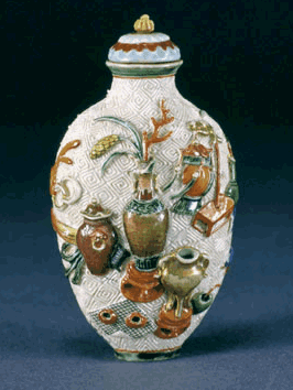 中國(guó)古代陶瓷文化作品之清粉彩雕瓷博古圖鼻煙壺