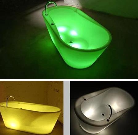 這種聚乙烯材質(zhì)的照明浴缸安裝有一組鹵素?zé)簦蛘吣阋灿衅渌囊粋(gè)選擇,一組可以編程的色彩斑斕的LED燈。同時(shí)浴缸的整體顏色也有白色、熒光色、檸檬黃、紅色和粉紅色多種選擇。