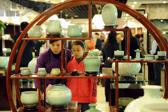 12月5日,觀眾在北京合璧興陶瓷藝術(shù)館參觀龍泉青瓷作品。