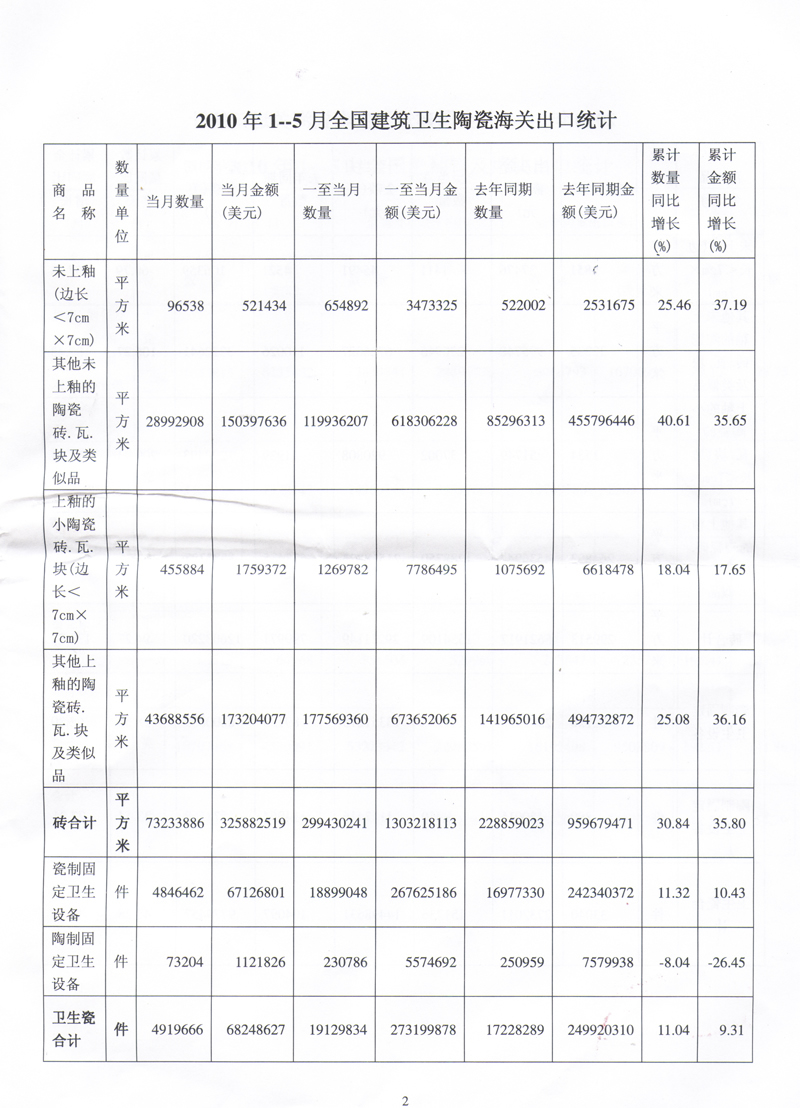 2010年1-5月全國(guó)建筑衛(wèi)生陶瓷海關(guān)出口統(tǒng)計(jì)