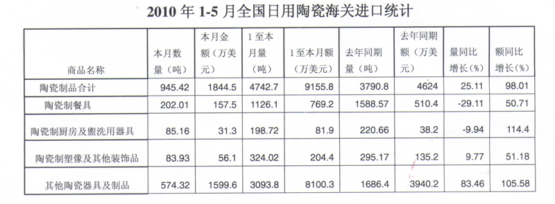 2010年1-5月全國日用陶瓷海關(guān)進(jìn)口統(tǒng)計(jì)