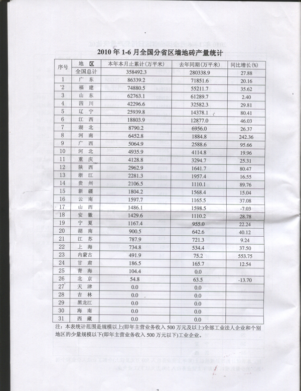 2010年1—6月全國分省區(qū)墻地磚產量統(tǒng)計