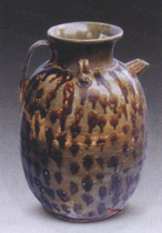 這件長沙窯壺高23厘米,底徑10厘米。通體青黃釉,褐彩,六棱形短流。肩上有雙系和一個(gè)雙條紋曲柄。胎質(zhì)灰白,較為厚重。整個(gè)造型樸實(shí)簡潔,具有明顯唐代長沙窯產(chǎn)品的風(fēng)格。