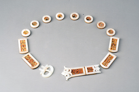 大唐西市博物館展有一組精美絕倫的唐代金框?qū)氣毎子駧с挕в?jì)十四事,八刓,四銙;另鉈尾、帶扣各一。玉質(zhì)晶瑩剔透、細(xì)膩溫潤。掐絲工藝做框,其間鑲嵌各色寶石,金玉珠寶相映生輝。