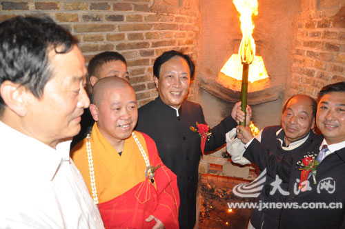 昨日上午11時許,剛剛修復(fù)成功的明代葫蘆窯在景德鎮(zhèn)市古窯民俗博覽區(qū)點火復(fù)燃,著名表演藝術(shù)家唐國強先生饒有興致地第一個將火把擲入窯火口。據(jù)悉,此次葫蘆窯燒造的陶瓷作品有1000余件,由景德鎮(zhèn)市一批陶瓷大師親手制作。不出意外的話,此次復(fù)燒的葫蘆窯中的陶瓷將于22日開窯認(rèn)證。
