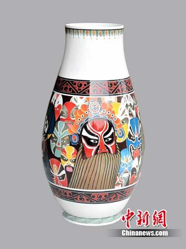 榮膺“2010中國收藏十大藝術(shù)陶瓷名品”特別獎的釉下五彩瓷精品《京劇臉譜》。中新網(wǎng)發(fā) 杜文建 攝