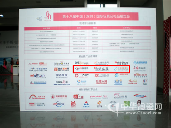 2010年10月21日-24日,由勵展華博主辦的國內(nèi)禮品第一大展,第十八屆中國(深圳)國際玩具及禮品展覽會在深圳會中心1-9號館隆重舉辦,來至國內(nèi)陶瓷行業(yè)第一門戶中華陶瓷網(wǎng)及旗下《陶瓷之路》中國瓷都德化網(wǎng)連系6屆以合作媒體身份參加展會。展會上中華陶瓷網(wǎng)攜帶部份客戶產(chǎn)品直接展示在全國客商面前,精美的陶瓷之路雜志更吸引了重多客商索閱,中華陶瓷網(wǎng)以網(wǎng)絡、平面、展會、線上線下b2c等多種模式結合,為陶瓷企業(yè)及客商建立了強勁的供應鏈,對企業(yè)品牌推廣起到顯著效果。