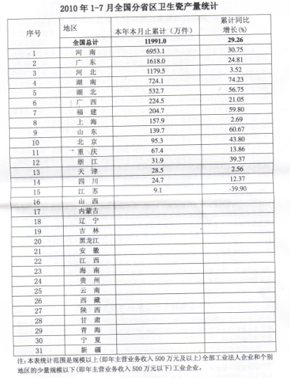 2010年1—7月全國分省區(qū)衛(wèi)生瓷產(chǎn)量統(tǒng)計
