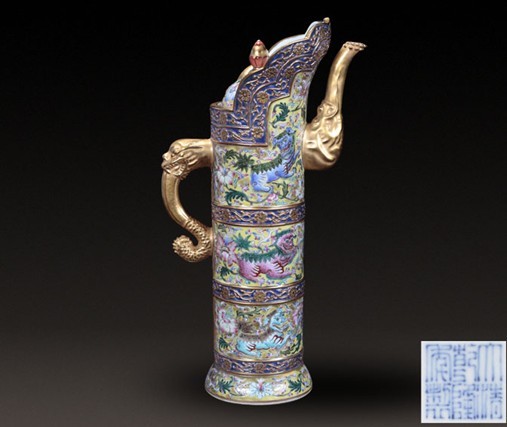 據(jù)東方璽宏征集部的李先生介紹:“多穆壺為元代流行壺式之一,為藏、蒙少數(shù)民族盛放乳液的器皿。明清時(shí)期,由于皇室對(duì)西藏及藏傳佛教的重視,許多具有西藏民族特色的器物開始進(jìn)入宮廷,多穆壺即是一例。清代大量的冊(cè)封和法事需要大量精美的法器和擺設(shè)配合,造辦處因此生產(chǎn)了許多這類器物,同時(shí)也供清帝賜高僧之用,故多穆壺更是流行,各種材質(zhì)均有制作,有金屬也有瓷質(zhì),且以金屬器為多,主要為各種金屬胎琺瑯器,存世常有所見,但瓷質(zhì)多穆壺比較罕見”。
