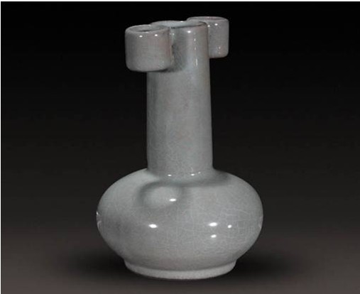 官窯貫耳瓶有瓶直口、長(zhǎng)頸、扁圓腹和圈足的特征,口沿兩側(cè)對(duì)稱置貫耳。通體施青釉,釉面開細(xì)碎片紋。此瓶在造型上摹仿西周青銅禮器。口耳相連的曲線增加了口部力度,與扁圓形腹部上下呼應(yīng),構(gòu)成視覺上的均衡,給人以穩(wěn)重之感。通身細(xì)碎開片,靜穆、優(yōu)美。