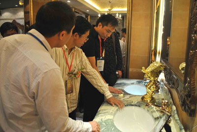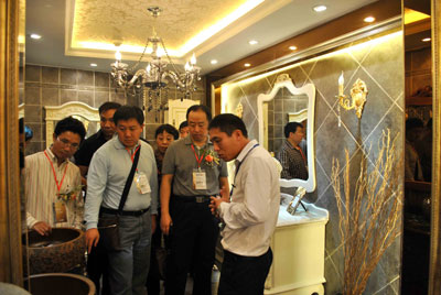 儀式結(jié)束后,由東易日盛&意德法家家居裝飾集團董事長、業(yè)之峰裝飾集團董事長、湖南鴻揚家裝集團董事長等20多家全國家裝巨頭企業(yè)總裁組成的總裁團開始了對展館的參觀及部分陶瓷、衛(wèi)浴企業(yè)的考察,首先到達的第一站就是富蘭克衛(wèi)浴。在溫馨、奢華的展廳中,考察團一行認真聽取了導購人員對產(chǎn)品的介紹,并親手觸摸了柜體、臺面,詳細詢問了整個工藝以及油漆的環(huán)保性。在交談中,他們對富蘭克產(chǎn)品給予了高度的評價和贊許,并對花梨木、雞翅木等新產(chǎn)品產(chǎn)生了濃厚的興趣。臨走前,各企業(yè)總裁與富蘭克衛(wèi)浴有限公司的總經(jīng)理及營銷總監(jiān)交換了名片,并表示,如果有時間希望能夠仔細了解和欣賞。
