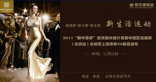 2010年11月10日,北京新中源陶瓷將在在十里河閩龍?zhí)沾煽偛炕匦轮性炊际猩铕^,開(kāi)啟“新生活運(yùn)動(dòng)”靈感之旅,同期舉辦2011“新趨勢(shì)·新元素·新主張”主題論壇,2011“新中源杯”亞洲室內(nèi)設(shè)計(jì)競(jìng)賽中國(guó)區(qū)選拔賽(北京站)啟動(dòng)儀式,七星奢華建材“上層傳奇V6”新品發(fā)布會(huì),“新中源陶瓷五星級(jí)展廳體驗(yàn)之旅,首屆新中源杯亞洲室內(nèi)設(shè)計(jì)大賽獲獎(jiǎng)作品成就展”。屆時(shí),業(yè)內(nèi)頂級(jí)大師及時(shí)尚界名模將親臨現(xiàn)場(chǎng),話設(shè)計(jì)心得,秀時(shí)尚趨勢(shì),近千精英聚會(huì),暢享視聽(tīng)盛宴。