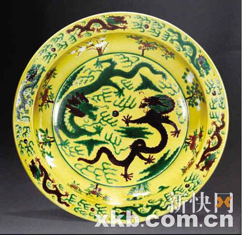 如書中收錄的清康熙黃地素三彩雙龍戲珠紋折沿大盤,其52厘米的直徑和完美的品相在拍賣市場上難找同類。據(jù)曾波強(qiáng)介紹,今年北京匡時(shí)拍賣會(huì)上一件42厘米直徑的黃地素折沿大盤已拍到675萬元,且品相不夠該藏品完美。