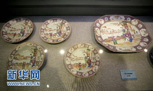 11月16日,清乾隆時期的廣彩人物圖餐具在新疆博物館展出。(記者 王菲)