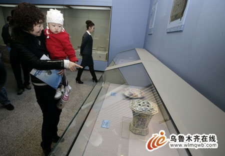 一歲半的劉珂羽小朋友在家人的帶領(lǐng)下觀看清嘉慶至道光年間的廣彩開窗人物紋八方形雙耳花插。