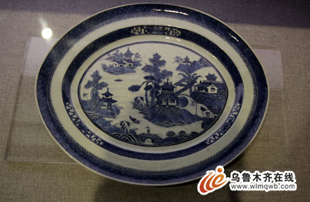 清嘉慶年間的青花梧桐庭院圖橢圓形肉盤。