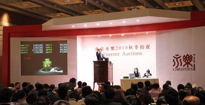 內(nèi)地唯一獲佳士得商標(biāo)授權(quán)的北京永樂在11月23日開始了其2010秋拍的首日拍賣,上午進(jìn)行的是中外名酒的拍賣,包括茅臺(tái)和來自法國(guó)頂級(jí)酒莊的紅酒。下午的瓷器及工藝品的拍賣場(chǎng)面火爆,原預(yù)計(jì)4個(gè)小時(shí)的拍賣進(jìn)行了近7個(gè)小時(shí),買家競(jìng)價(jià)頻頻,場(chǎng)面十分熱烈。