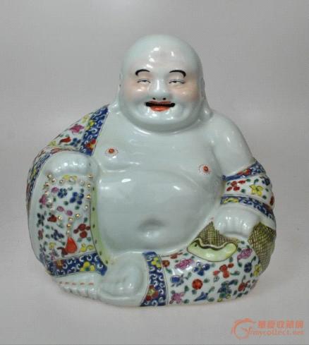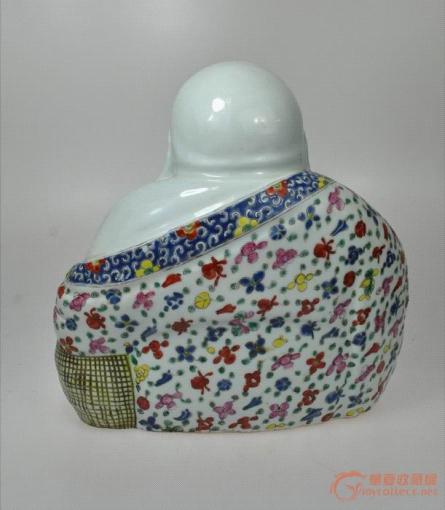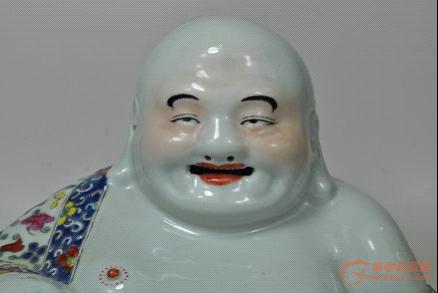 華夏收藏網(wǎng)第278場標王便是一尊民國朱茂生款粉彩袈裟佛像,其形象為后期的笑佛,此尊呈坐姿,光頭圓頂,面容豐腴,大耳垂肩,壽眉如彎月,善目灑慈光,隆鼻笑口,頻現(xiàn)笑坑。雙手扶膝,赤腳端坐,身批彩色花紋袈裟,右手拿念珠,面容慈祥豐滿,雙耳垂肩,笑顏迎人,顯露出一幅大慈大祥的神態(tài),使人感到無比親切。瓷質(zhì)細膩,釉面肥厚,紋飾繁復(fù),紅黃青藍黑,五彩繽紛,做工集繪畫剔堆刻于一體,技藝高超。而今遺留下來的美品較少,其空間較大,實為收藏觀賞佳品。