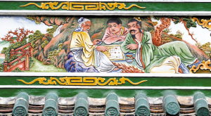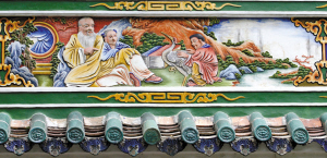 這幅灰塑作品,建于祖廟西側(cè)外圍墻上,同樣為佛山灰塑世家布氏傳人布輝于1956年所作,作品人物造型生動(dòng),個(gè)性突出,講述的是書圣王羲之的故事。