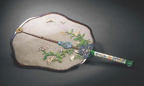 保利拍品 象牙絲編織菊蝶圖畫琺瑯柄宮扇