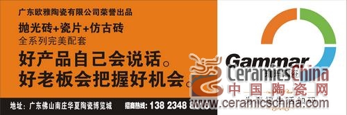 2010年陶瓷行業(yè)收官力作——珈瑪陶瓷(Gammar)驚艷出世,集拋光磚、瓷片、仿古磚全系列完美配套于一體,為“建陶航母”廣東歐雅陶瓷企業(yè)順應(yīng)市場需求,搶占“十二五”制高點,“推進城鎮(zhèn)化”,“把擴大消費需求作為擴大內(nèi)需的戰(zhàn)略重點,進一步釋放城鄉(xiāng)居民消費潛力”,新推的鉆石級高端品牌,為廣大陶瓷經(jīng)銷商財富加碼,為廣大消費者幸福生活加碼。