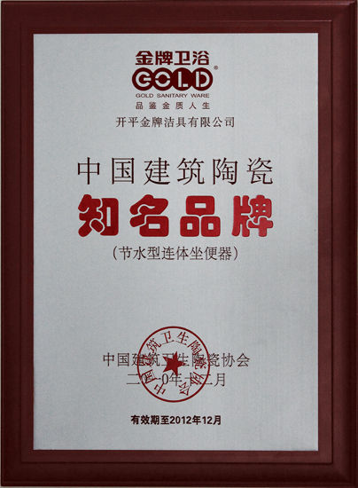2010年12月1日,中國建筑衛(wèi)生陶瓷協(xié)會第六屆三次理事會暨2010年年會在佛山市南海區(qū)南國桃園旅游度假區(qū)楓丹白鷺酒店隆重舉行,來自全國各主要產(chǎn)區(qū)的建筑衛(wèi)生陶瓷企業(yè)代表出席了會議。大會對建陶行業(yè)的一批優(yōu)秀品牌進(jìn)行了表彰,金牌衛(wèi)浴憑借其推出的潔具產(chǎn)品在多種技術(shù)性能、外觀設(shè)計(jì)、節(jié)水環(huán)保等方面的出色表現(xiàn),被評選為“中國建筑陶瓷知名品牌”。