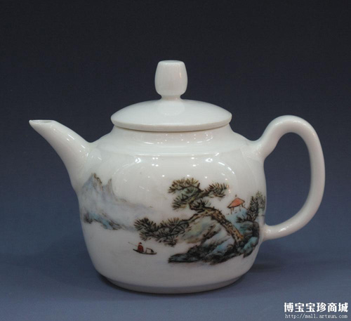 圖中展示的這件來自于博寶寶珍商城的粉彩山水壺也是王桂英女士的作品,作品既有文雅氣韻,勁秀有力,又形神俱到,意境深遠(yuǎn),胎質(zhì)細(xì)膩,胎底色為潔白如玉,純凈無暇,線條滑潤流暢,構(gòu)圖簡潔明了,意境寧靜高遠(yuǎn)。這件粉彩山水壺是不可多得的當(dāng)代瓷器藝術(shù)佳作,非常值得收藏觀賞,體現(xiàn)悠悠意境。(博寶藝術(shù)評論員 孫瑞峰 撰文)