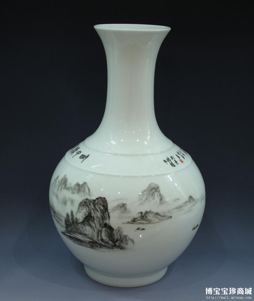 汪桂英女士的陶瓷藝術(shù)品,既有父親的遺風(fēng),又有個人特色,廣泛采用水畫名家名畫的畫風(fēng)畫技,意境寧靜高遠(yuǎn),古韻與新意俱佳。圖中展示的這件墨彩瓶《唐詩詩意圖》便是出自汪桂英女士之手,收藏于博寶寶珍商城,陶瓷造型上極其精巧,新穎獨特極富現(xiàn)代美,工筆寫意更是意蘊(yùn)悠長,具有傳統(tǒng)水墨的詩性魅力,山水重巒疊嶂,作品具有女性細(xì)膩雅致的獨特氛圍,更是具有極高的收藏價值和審美情趣。