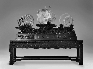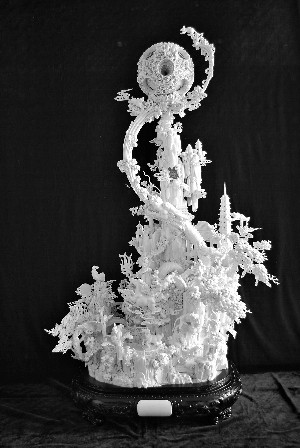 玉雕作品《日月同輝》售價(jià)2億元,是3件一套的作品,原料出自一塊62cm×62cm×9cm的黃龍玉原石上,為當(dāng)今黃龍玉石雕刻一絕。牙雕作品《盛世乾坤》從設(shè)計(jì)制作到完成,耗時(shí)20年。其主體巨龍噴出水柱襯托起龍珠(57層象牙球),最為珍貴的57層象牙球直徑17厘米,每層薄如絲紙,且均為鏤空雕刻,層層可轉(zhuǎn)動(dòng)。制作象牙球的材料是一支珍藏上百年的非洲象牙,重80公斤。
