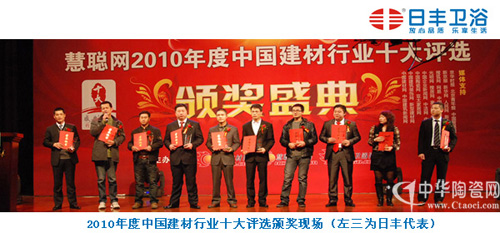 2010年12月中旬,日豐衛(wèi)浴在“中國(guó)新勢(shì)力-2010年度建材行業(yè)十大評(píng)選頒獎(jiǎng)盛典”上榮獲“2010建材行業(yè)十大衛(wèi)浴品牌”稱號(hào)。由慧聰建材網(wǎng)、慧聰陶瓷網(wǎng)、慧聰衛(wèi)浴網(wǎng)聯(lián)合舉辦的“中國(guó)新勢(shì)力-2010年度建材行業(yè)十大評(píng)選頒獎(jiǎng)盛典”共頒發(fā)了“十大衛(wèi)浴品牌”、“十大陶瓷品牌”、“十大風(fēng)云人物”等共六大獎(jiǎng)項(xiàng)。本次建材行業(yè)評(píng)選活動(dòng)旨在樹立行業(yè)品牌形象,推崇企業(yè)自主創(chuàng)新發(fā)展,表彰在本年度為中國(guó)建材行業(yè)發(fā)展作出重大貢獻(xiàn)的領(lǐng)軍人物和企業(yè),推薦一些具有強(qiáng)大潛力、全新思維和理念的新晉品牌。