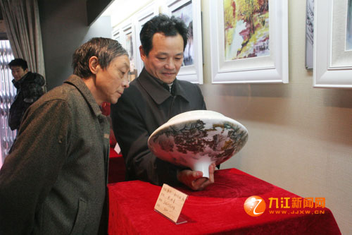 為加強(qiáng)兩地文化交流,12月9日,由中國(guó)工藝美術(shù)大師賴德全等領(lǐng)銜的景德鎮(zhèn)市陶瓷研究所工藝美術(shù)大師陶瓷作品展在九江民俗博物館隆重開(kāi)幕。陶瓷名家現(xiàn)場(chǎng)表演釉上彩和“潑墨”技藝,一幅幅山泉淙淙、峰巒疊嶂的精美畫(huà)卷在觀眾嘖嘖稱奇中躍然于陶瓷上。