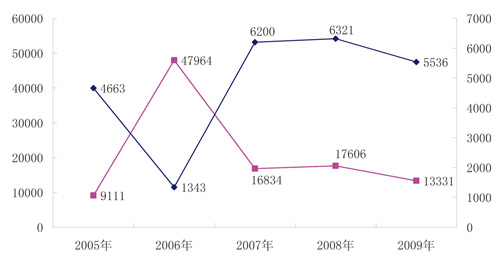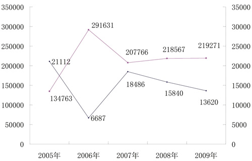 2005~2009年中國色釉料進(jìn)出口量(噸)