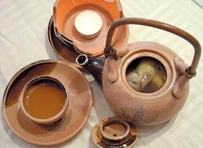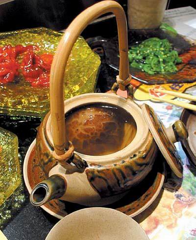 傳統(tǒng)日本料理中也有茶壺湯,用的是陶質茶壺,壺頂上也倒扣著一個茶盅,內容則以菇、海鮮、蔬菜和高湯為主,大同小異。一茶壺有3、4杯湯,極其鮮美。喝湯的同時還可以吃掉壺中的材料,一舉兩得。