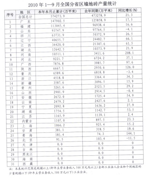 2010年1—9月全國分省區(qū)墻地磚產(chǎn)量統(tǒng)計