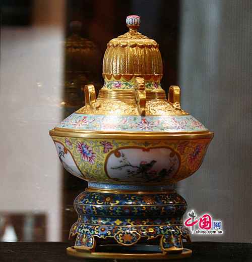 中國(guó)收藏2010十大藝術(shù)陶瓷名品展上的精美作品。仿古琺瑯彩描金蓋缽(博夢(mèng)堂 攝影報(bào)道)