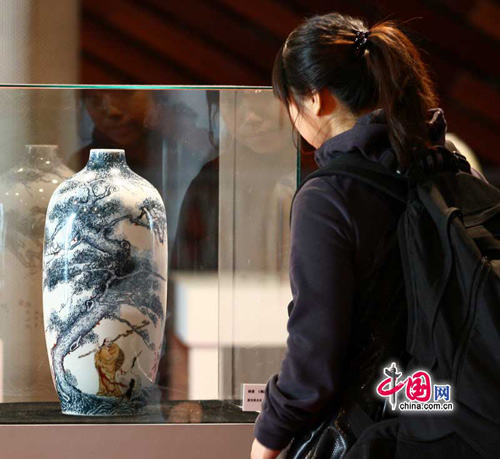 中國(guó)收藏2010十大藝術(shù)陶瓷名品展上的精美作品。觀展--作品是《鶴弄拙煙》(博夢(mèng)堂 攝影報(bào)道)