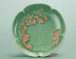盤(pán)淺腹,圈足矮小,形制為元代流行樣式,但作五個(gè)花口甚少見(jiàn),一般都是六出花口。內(nèi)足在釉上堆貼梅樹(shù)及月亮,呈紅褐色,樹(shù)下方刻水紋及梅月倒影。釉呈梅子青色,青翠欲滴,溫潤(rùn)如玉。此盤(pán)采用的堆塑修飾技巧也達(dá)到了很高水平。“堆塑”是一種陶瓷修飾技法,即將模印或雕塑成的立體狀紋飾貼附在坯上,然后燒制而成。由于料中含有一定量的氧化鐵,在燒成后冷卻階段經(jīng)過(guò)兩次氧化,紋飾表面呈紫紅色,在青釉的襯托下,色彩鮮艷奪目,取得很好的修飾效果。這一裝飾手法在元代比較流行,到了明代則比較少見(jiàn)。從盤(pán)底堆飾的梅枝形狀、月亮及淡淡的梅月倒影等整個(gè)構(gòu)思來(lái)看,則取意于北宋詩(shī)人林逋《山園小梅》中的詩(shī)句:“疏影橫斜水清淺,暗香浮動(dòng)月黃昏。”