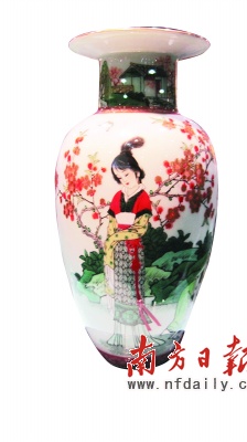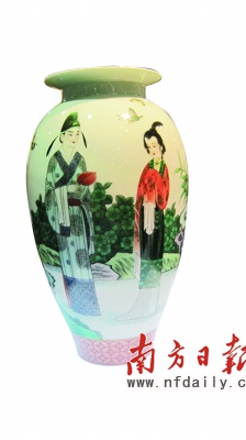 工藝美術(shù)大師李文躍為本次展會特地創(chuàng)作了大型粉墨彩瓷板《曲水流觴》,《曲水流觴》取材于王羲之《蘭亭集序》,畫面中一共48個(gè)人物,姿態(tài)神情各異,描述了魏晉時(shí)期文人雅士隨心所欲、放蕩不羈的名士風(fēng)范。作品把墨彩技法和粉彩技法巧妙地融合在一起,相映相襯。據(jù)李文躍介紹,粉墨彩結(jié)合是陶瓷藝術(shù)創(chuàng)作上的一個(gè)創(chuàng)新,他們從2000年開始,不斷探索實(shí)驗(yàn),目前已經(jīng)將這種技法運(yùn)用得相當(dāng)成熟。和《曲水流觴》一起展出的還有李文躍的高溫窯變粉墨彩作品《春風(fēng)十里麗人行》。這件作品的背景先用1800℃高溫?zé)埔院?再進(jìn)行主題繪制,然后再用780℃高溫?zé)啤_@件作品由于燒制難度較高,李文躍稱之“千窯一寶”。