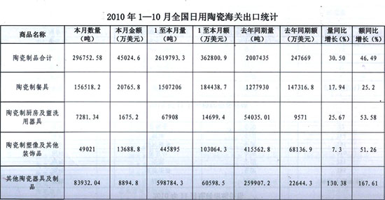 2010年1—10月全國(guó)日用陶瓷海關(guān)出口統(tǒng)計(jì)