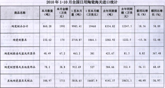 2010年1—10月全國日用陶瓷海關(guān)進口統(tǒng)計