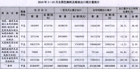 2010年1—10月全國色釉料及熔塊出口統(tǒng)計量統(tǒng)計